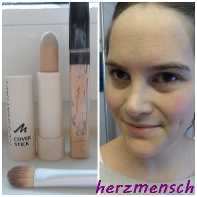 Ich fange immer mit dem MANHATTEN Cover Stick an und trage diesen auf meinem Rötungen und auf meinen Augenringen auf. Diesen verblende ich dann mit meinem Fingern. Um meine Augenringe zu kaschieren nehme ich den von Maybellin den FIT me! Concealer den verblende ich erst mit einem Concealer-Pinsel und anschließend mit dem Finger. Das Ergebnis sieht dann so aus: